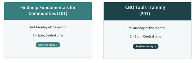 - Register and attend both the Findhelp Fundamentals for Communities (101) and CBO Tool Training (201) webinars offered by our Learning & Enablement team.