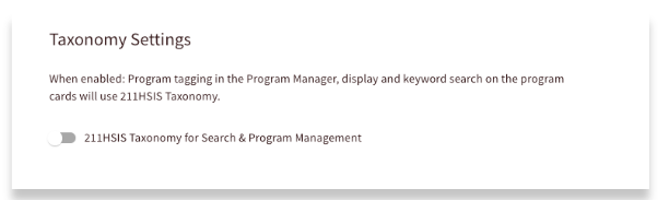 You can choose to enable the 211 HSIS taxonomy as an alternative to the standard Findhelp taxonomy. Once enabled, these standardized category labels will appear directly on your program cards.