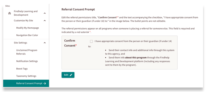 To edit the Referral Consent Prompt, click the Edit button and update the text.