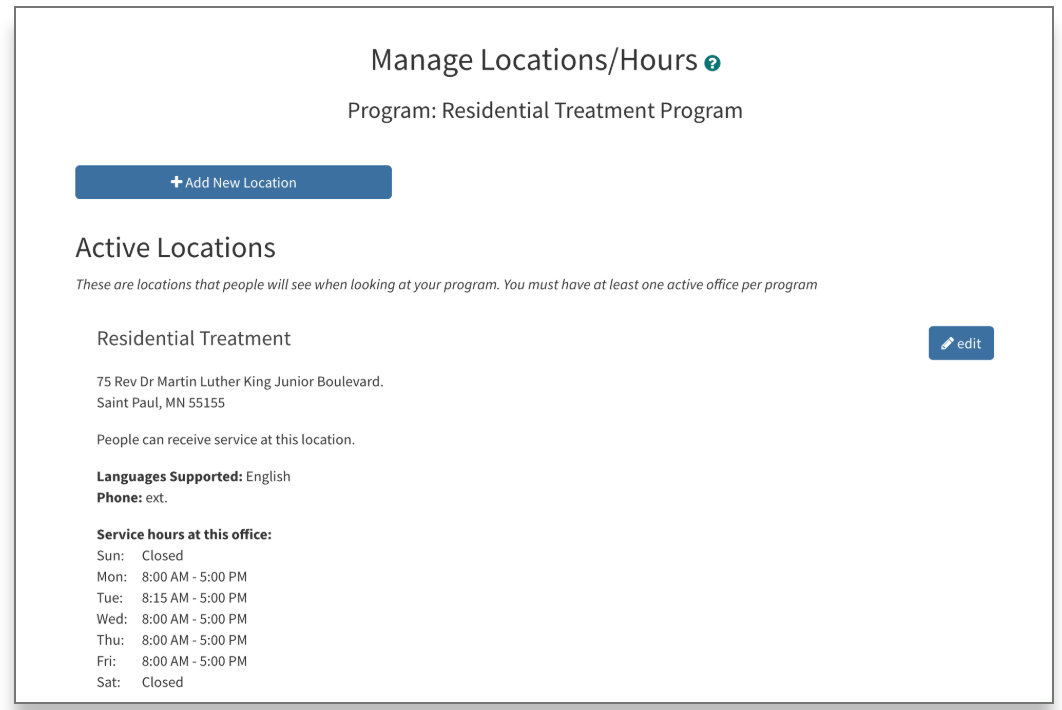 In this section, you can view all office locations associated with your program. To make changes, use the Add New Location button to create a new entry, or click Edit next to an existing location to update its details.