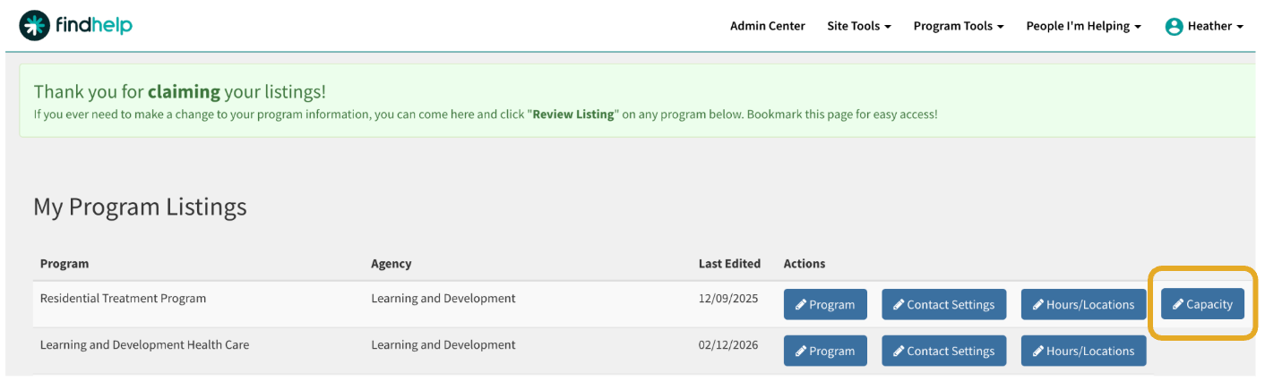 This will take you to your program listings dashboard where you can make updates to your program listing. In this article, we will be going over Hours / Locations and Capacity.