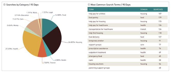 The Search Activity Dashboard shows search trends for members of your group(s). You can see overall search trends and use filter to look at searches within specific geographic areas or social care priorities.