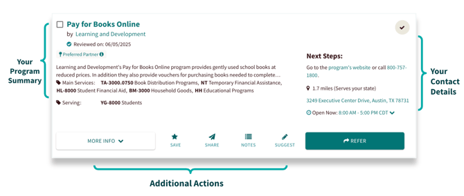 The Program Card provides a high-level summary of your services so users can find what they need quickly. It is comprised of three main sections.