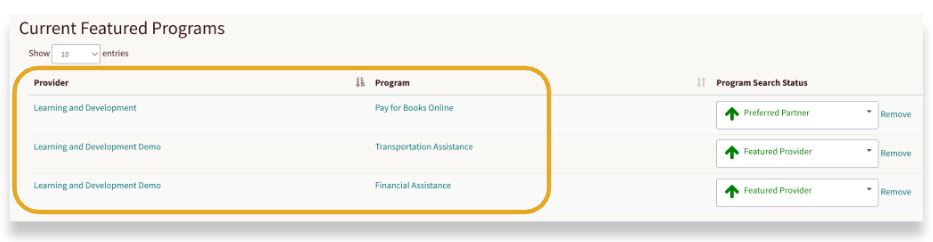 To update or remove a featured label, find the program you want to edit in the Current Featured Programs list. You can use the search bar or sorting options to locate it quickly.