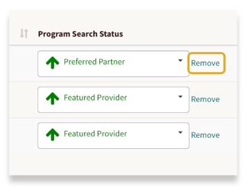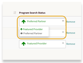 You can update a program's featured label by using the drop-down menu in the search status column and selecting the updated label. The new label will appear on the program card.
