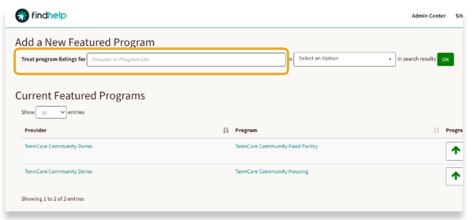 Step 3: Paste the program or provider URL into the Treat program listings for field. From the Select an Option dropdown menu, choose the featured label you wish to assign. Then click OK to add that label to that program or provider.