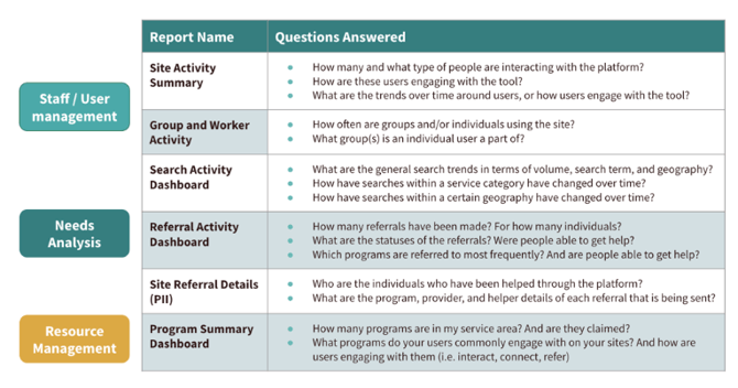 1. Review your Findhelp analytics offerings- These reports can share insights into your site’s usage and search trends, top community needs, and which programs are active within your service area