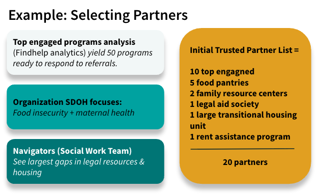 - Building a trusted network requires selection of partners (as outlined above, outreaching/engaging these partners, and making them visible to individuals who will be sending referrals)