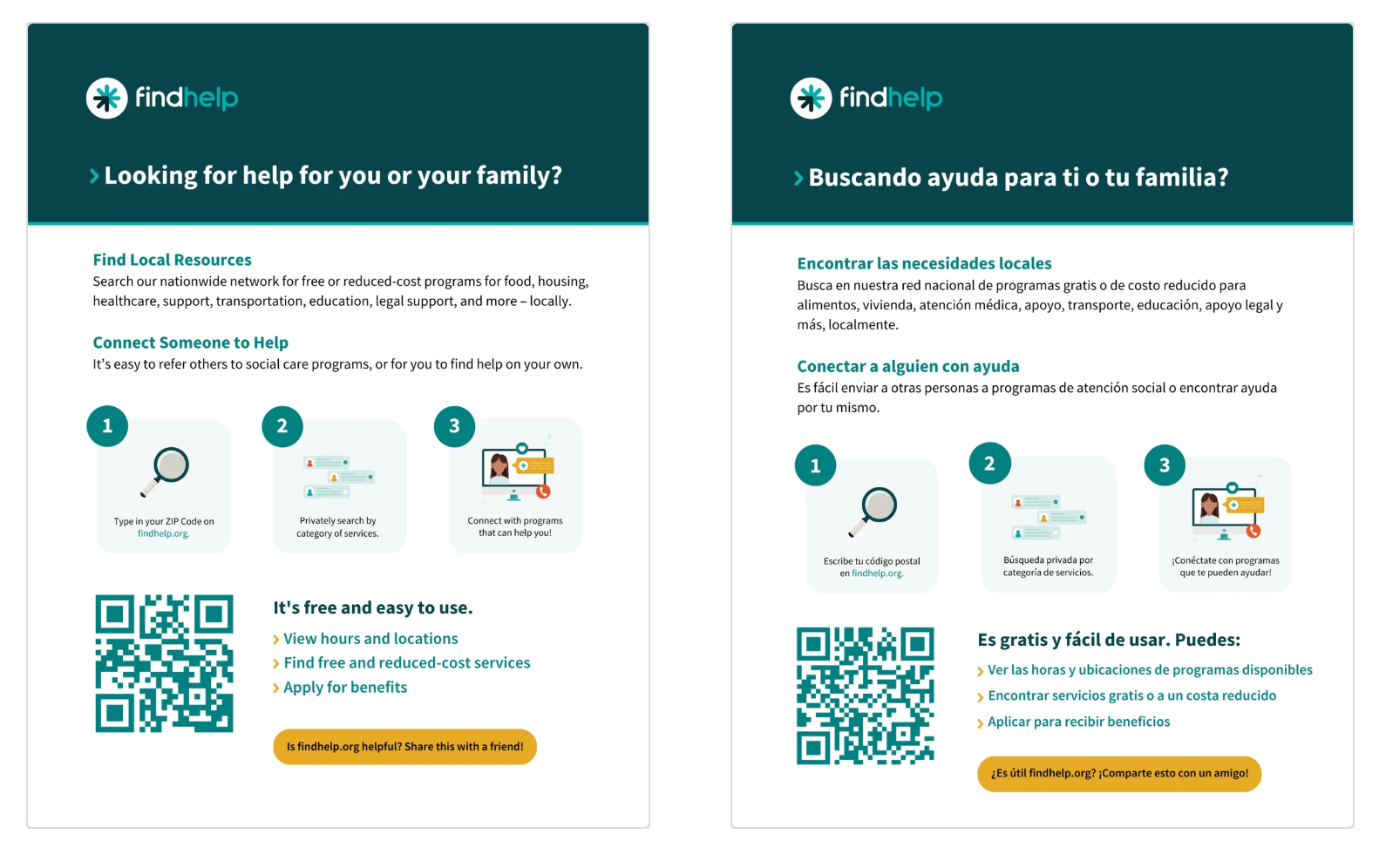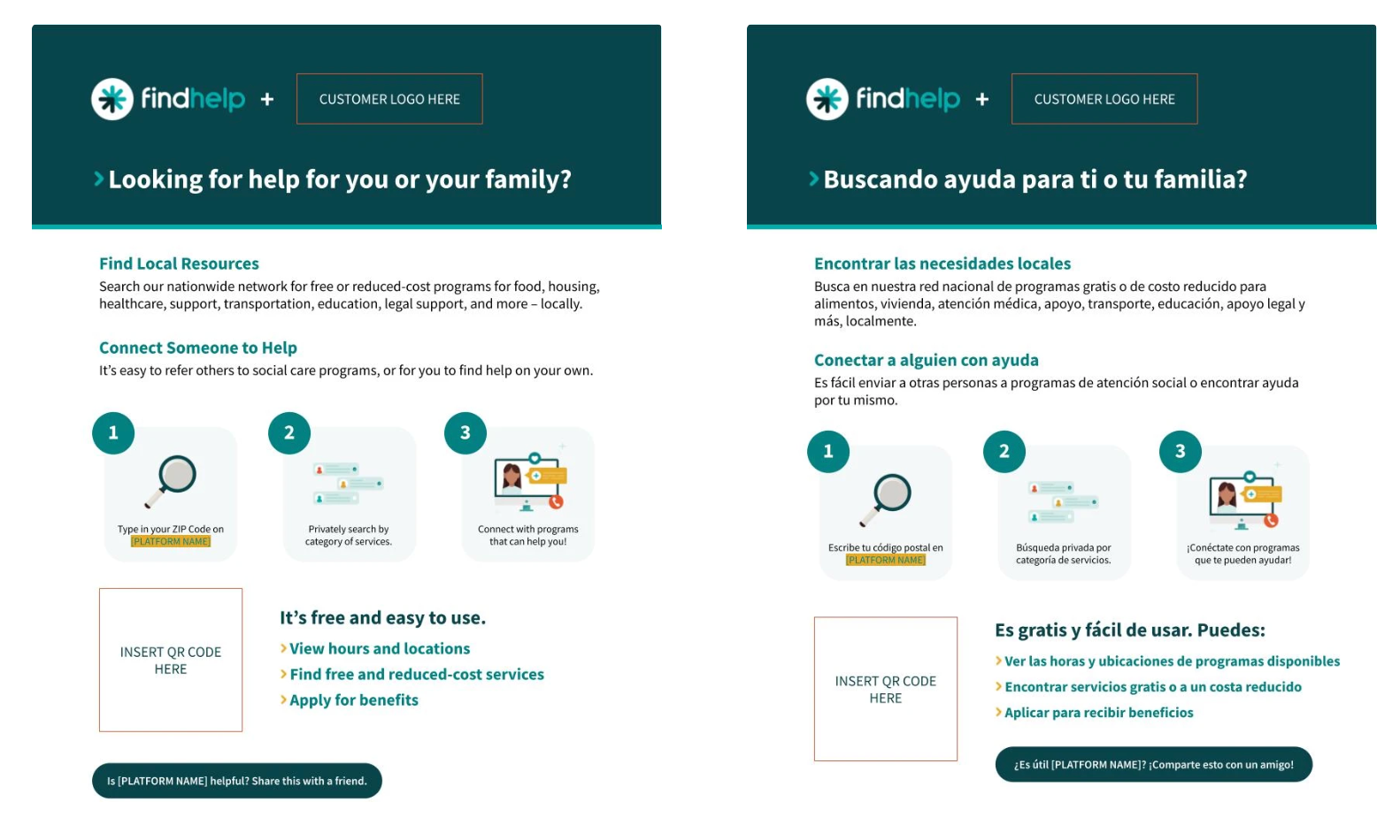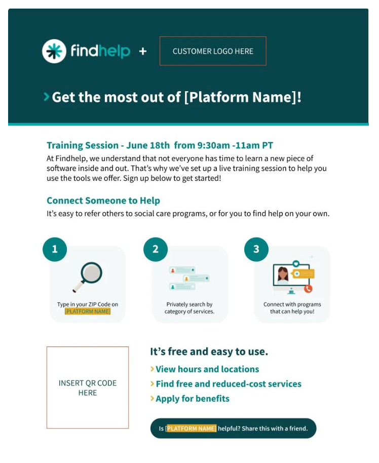 Pass out these postcards, flyers, and bookmarks to your community to encourage people to search and connect with social care resources on your branded customer site.