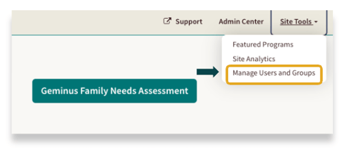 To access your Manage Users and Groups dashboard, make sure you are signed into your site. Then click on Site tools, and select Manage Users and Groups.