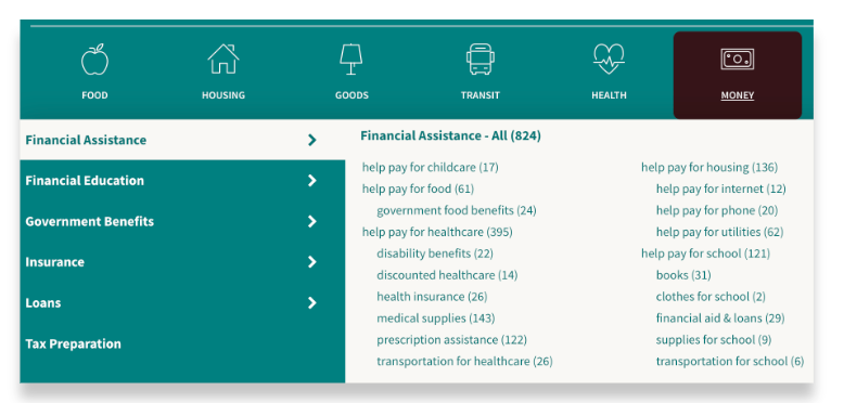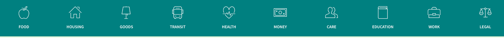 At the top of your screen, you'll see a toolbar with search categories, like "food" and "housing," all the way to "legal."