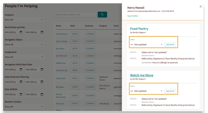 Once you have located the person you are helping, you may refer them to additional programs, access their full Profile, access a summary view of the profile or track updates for how you're helping that person.