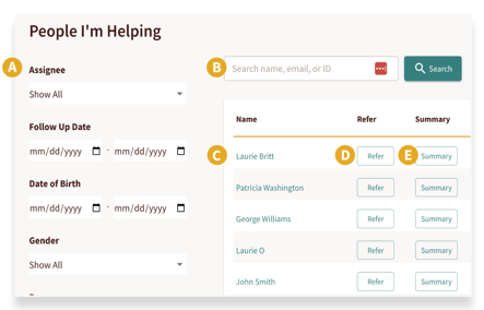 The People I'm Helping dashboard is your central hub for tracking the individuals you've assisted. It provides a complete list of everyone you've helped, along with key information and direct links to their Seeker Profiles. If your team has Team Navigation enabled, the dashboard will also show you who your teammates are helping, making it easy to collaborate.