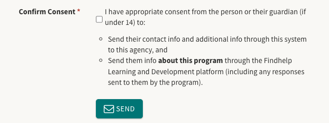 Because submitting a referral involves sharing data with another organization, you must confirm the consent checkbox before proceeding. Please note that only the information provided in this specific form is shared with the provider.