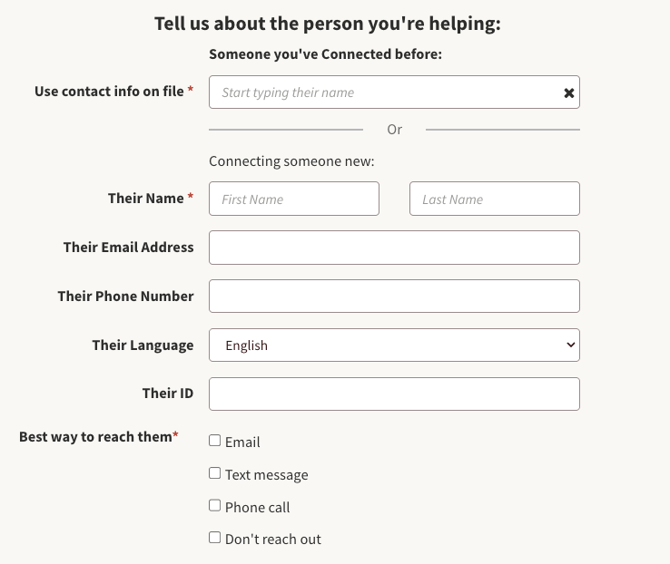 You will still start by typing their name into the Someone You've Connected Before field. If you or your team have helped them before, it will let you click on their name and have their information auto-populate into the form.