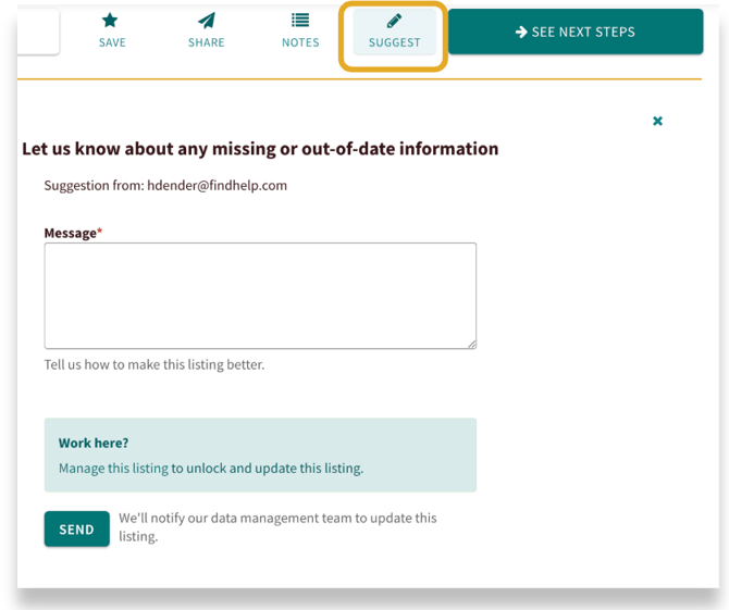 - Suggested Edits: Any user on the Findhelp network can suggest an edit. Findhelp's curation team manually reviews every suggestion to ensure its accuracy before the update is published.