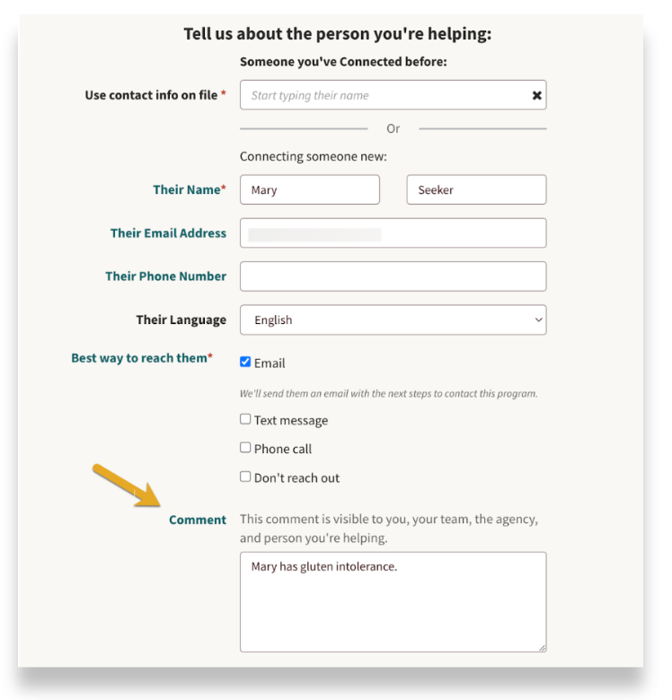 When you fill out a referral form for someone, you can leave comments in the comments section. These comments are shared with both the person being referred and the program in the referral email. They also appear on the seeker's profile.