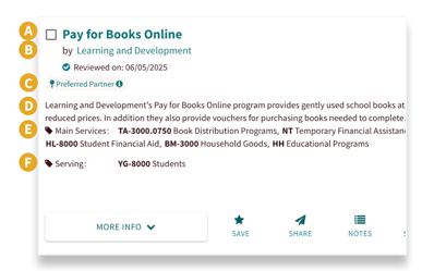 F. Serving Tags: These tags help you filter your search results and quickly see who the program is for.