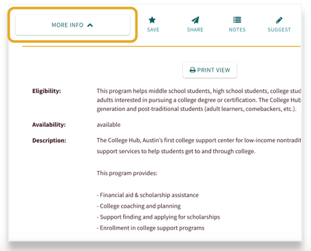 On each program card, you'll see a "More info" button. Click it for a dropdown with extra details about the program, like: